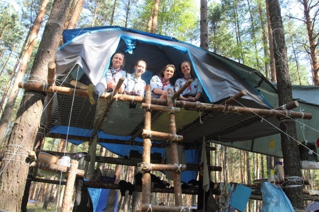 To harcerki i harcerze ze Stowarzyszenia Harcerstwa Katolickiego Zawisza rozbili swój obóz. Przy pomocy konarów oraz sznurka potworzyli konstrukcje na kilku metrach wysokości. Niektóre są nawet dwupoziomowe. Dopiero na tych stelażach rozbili swoje namioty. - Nie pada nam na głowę, nie podtapia nas przy deszczach, pająki nie wchodzą - wylicza jednym tchem Ania.