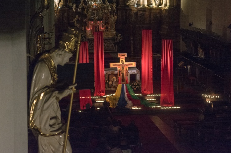 Miejscem wspólnej modlitwy w piątkowy wieczór 18 października była Bazylika Erazma i Pankracego. Jak zawsze przy tego typu nabożeństwach panował półmrok, rozbrzmiewał śpiew, czytano Boże słowo. Były też chwile ciszy. Od Krzyża wychodziły szarfy w pięciu kolorach, symbolizując 5 kontynentów. Zwrócono w ten sposób uwagę na Nadzwyczajny Miesiąc Misyjny, który przypada w październiku.