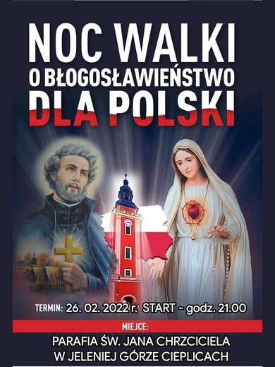 W najbliższą sobotę, 26 lutego, wieczorem, w kilku parafiach diecezji legnickiej odbędą się modlitwy nazwane nocą walki o błogosławieństwo dla Polski. Będziemy się modlili za przyczyną Niepokalanego Serca Maryi, a także św. Andrzeja Boboli, patrona Polski.