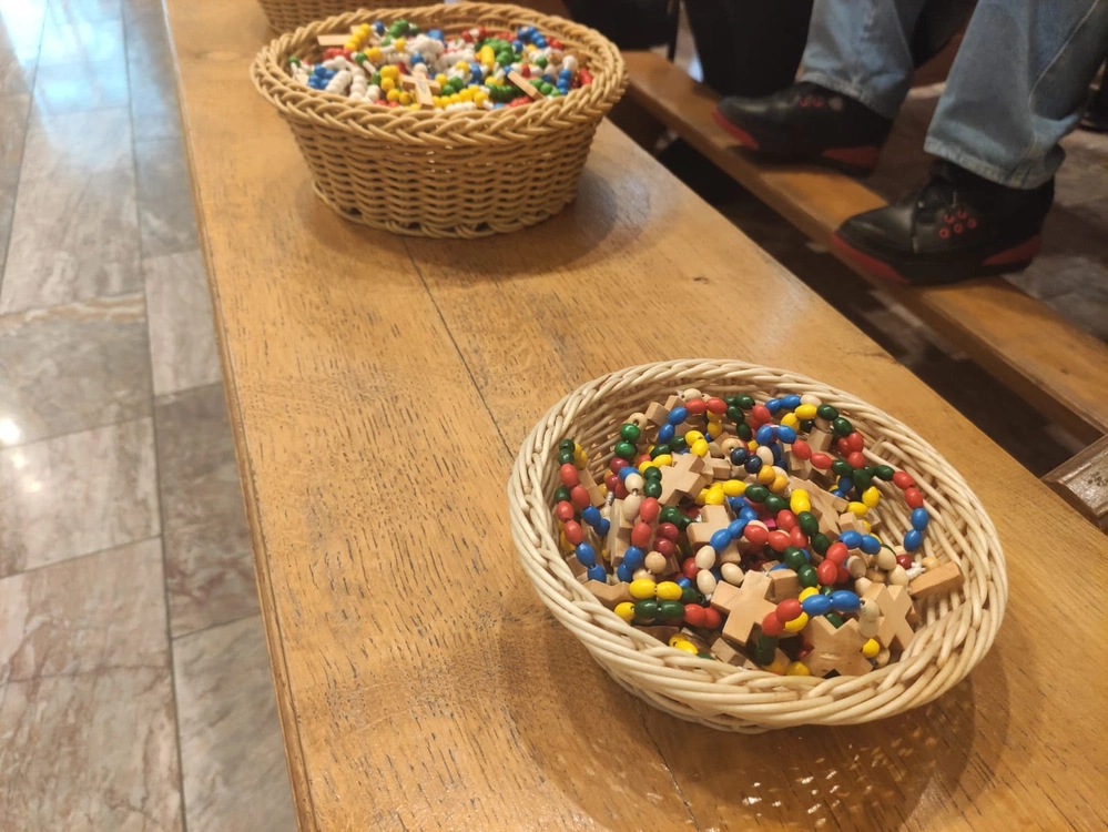 Zanim zebrani wzięli udział w Mszy św., klęknęli przed Najświętszym Sakramentem i rozpoczęli modlitwę różańcową. Siostra Olga Soroka CSMM przypomniała o znaczeniu kolorów różańca misyjnego wymyślonych przez sługę Bożego abp. Fultona Sheena. - One symbolizują poszczególne kontynenty - zielony to Afryka, czerwony to Ameryki, niebieski - Australia i Ocenia, biały - Europa, a żółty - Azja - mówiła siostra.