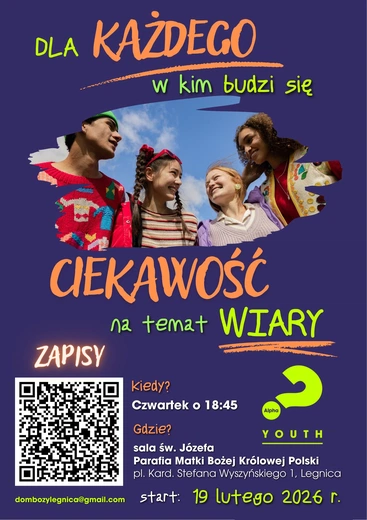 Katarzyna Skorupska: Kurs Alfa dla młodych startuje w czwartek 19 lutego. Jest on skierowany dla młodzieży czyli do osób w wieku od 13 do 18 lat. Szczególnie dla osób przygotowujących do przyjęcia bierzmowania bądź niedawno bierzmowanych. Wszystko odbędzie się w sali św. Józefa w parafii Matki Bożej Królowej Polski w Legnicy. Będą to spotkania w czwartki o 18.45. Będzie to 8 czwartków. Będziemy na nich poruszali tematy m.in.: jak czytać Biblię, było też z Pismem Świętym, kim jest Duch Święty, dlaczego Jezus umarł?, jak się modlić? Jak najpełniej przeżyć swoje życie?
